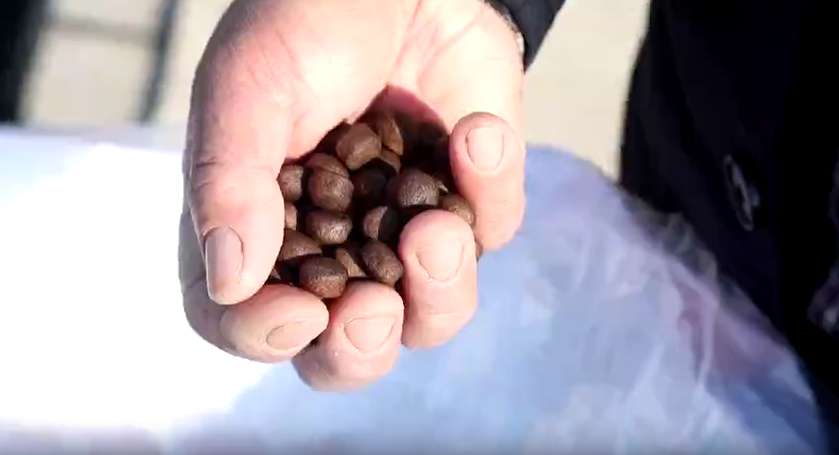 在舟山普陀西轩岛的优辰水产饲养场,担任人陈优存正在投喂行将上市的大黄鱼,这批约10万尾八两到一斤重的鱼,全程运用浙江大学海洋学院王岩教授团队研制的合作饲料。